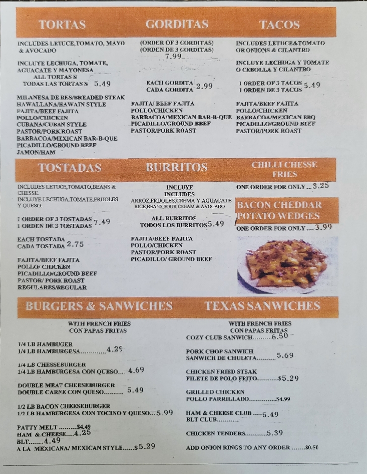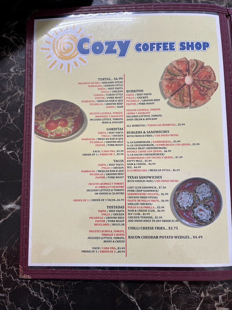 Cozy Cafe's menu shines with its Texas-inspired offerings. Signature dishes like the Cozy Club Sandwich ($7.50) and Chicken Fried Steak ($6.99) deliver hearty flavor with every bite. For lighter fare, try the Grilled Chicken ($5.99) or savor some Chilli Cheese Fries ($3.75).
